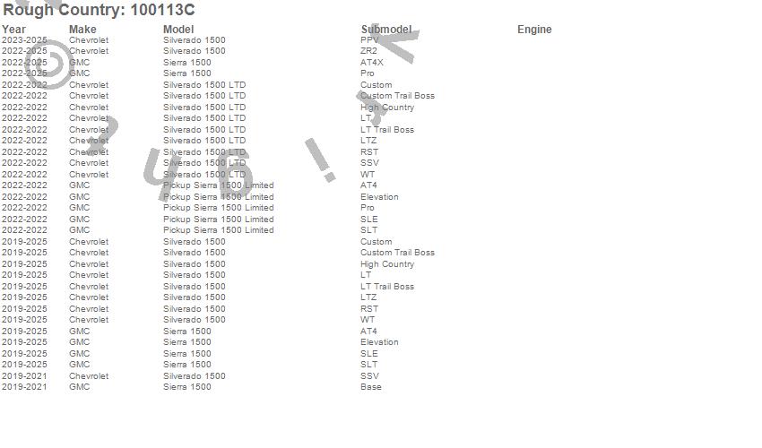 Brand: Rough CountryPart Number: 100113CSuspension Air Spring Kit Type: 2-3.5 in. Lift Kit - w/CompressorUPC: 840269971181