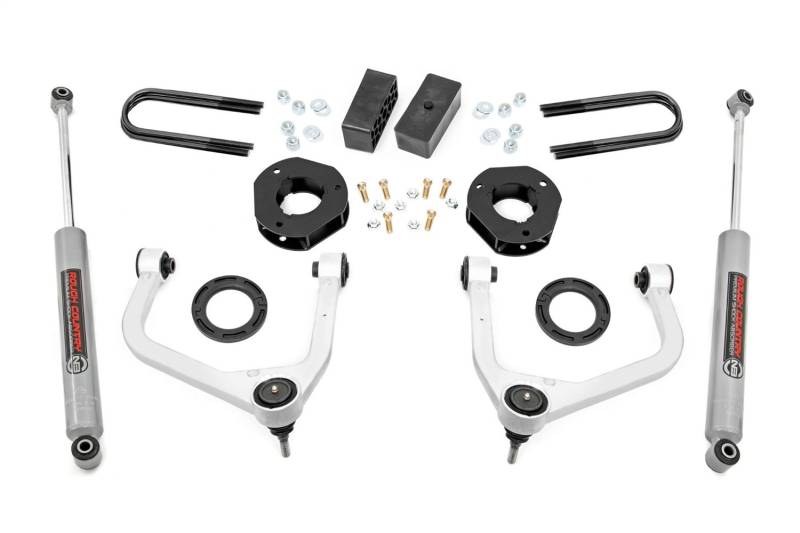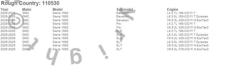 Brand: Rough CountryPart Number: 110530Lift Kit-Suspension w/Shock Type: 3.5 in. Lift - Mono-Leaf Spring - Strut Spacers w/N3 Rear Shocks - Aluminum Control Arm FinishUPC: 840269972034