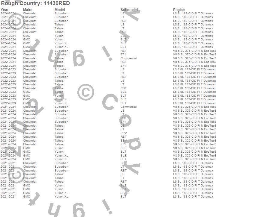 Below is an abbreviated list of applications for the Suspension Lift Kit.Suburban, Tahoe, Yukon, Yukon XL, Chevrolet, GMC, 2024, 2023, 2022, 2021