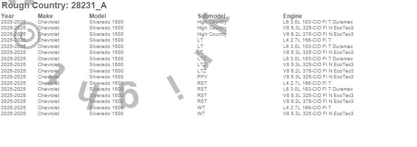 Below is an abbreviated list of applications for the Suspension Lift Kit w/Shocks.Silverado 1500, Chevrolet, 2025
