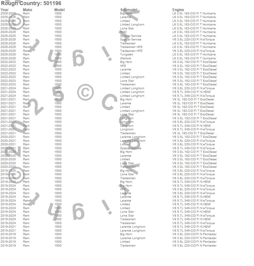Brand: Rough CountryPart Number: 501196Suspension Front Leveling Kit Type: Stock Lift - [2] Premium N3 Loaded Struts - 23.46 in. Extended Length - 17.63 in. Collapsed LengthUPC: 840269965999
