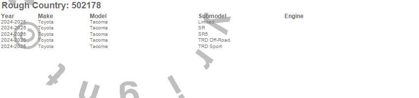 Brand: Rough CountryPart Number: 502178Suspension Strut Assembly Type: 3.5 in. Lift - 25.59 in. Extended Length - 19.84 in. Collapsed Length - PairUPC: 840269965944