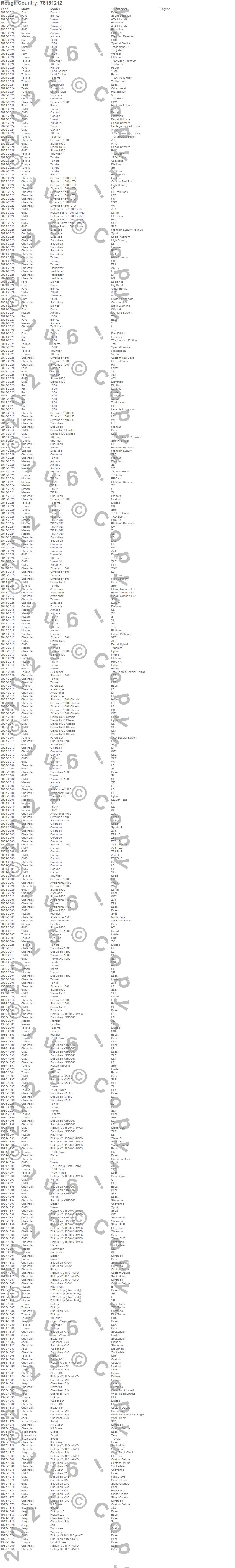 Below is an abbreviated list of applications for the Series 78 Wheel.1500, 4Runner, Armada, Avalanche, Avalanche 1500, Blazer, Blazer K5, Bronco, C10 Pickup, C15 Suburban, Canyon, Cherokee (SJ), Colorado, Cybertruck, D21 Pickup (Hard Body), Escalade, FJ Cruiser, Frontier, Grand Wagoneer, J10