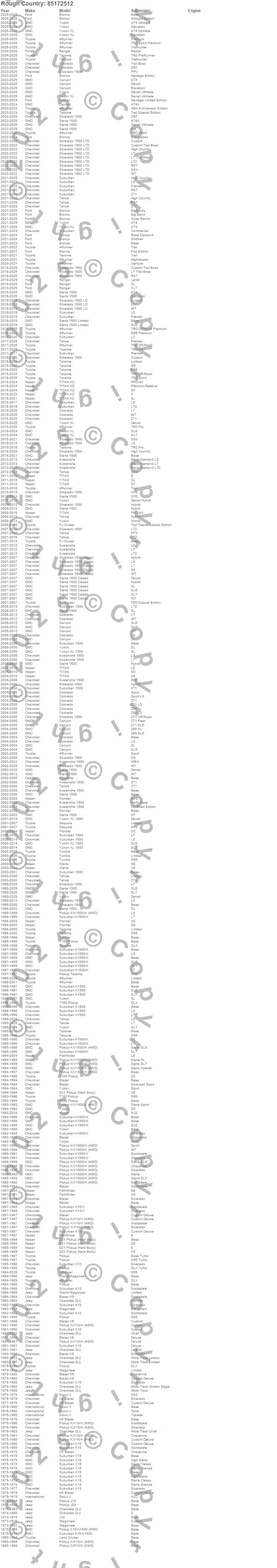 Below is an abbreviated list of applications for the Series 85 Wheel.4Runner, Avalanche, Avalanche 1500, Blazer, Blazer K5, Bronco, C10 Pickup, C15 Suburban, Canyon, Cherokee (SJ), Colorado, D21 Pickup (Hard Body), Escalade, FJ Cruiser, Frontier, Grand Wagoneer, J10, J20, K10 Pickup, K10 Suburban
