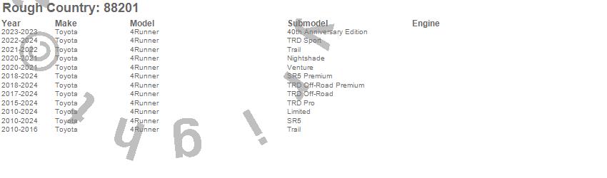Below is an abbreviated list of applications for the Roof Rack System.4Runner, Toyota, 2024, 2023, 2022, 2021, 2020, 2019, 2018, 2017, 2016, 2015, 2014, 2013, 2012, 2011, 2010