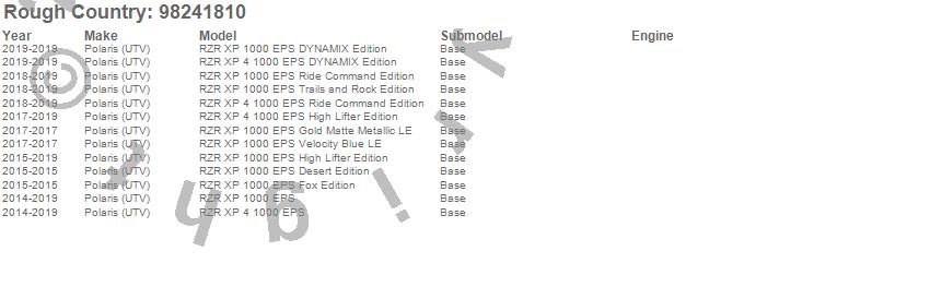 Below is an abbreviated list of applications for the Windshield.RZR XP 1000 EPS, RZR XP 1000 EPS Desert Edition, RZR XP 1000 EPS DYNAMIX Edition, RZR XP 1000 EPS Fox Edition, RZR XP 1000 EPS Gold Matte Metallic LE, RZR XP 1000 EPS High Lifter Edition, RZR XP 1000 EPS Ride Command Edition, RZR XP 1000 EPS Trails and Rock Edition, RZR XP 1000 EPS Velocity Blue LE, RZR XP 4 1000 EPS, RZR XP 4 1000 EPS DYNAMIX Edition, RZR XP 4 1000 EPS High Lifter Edition, RZR XP 4 1000 EPS Ride Command Edition, Polaris (UTV), 2019, 2018, 2017, 2016, 2015, 2014