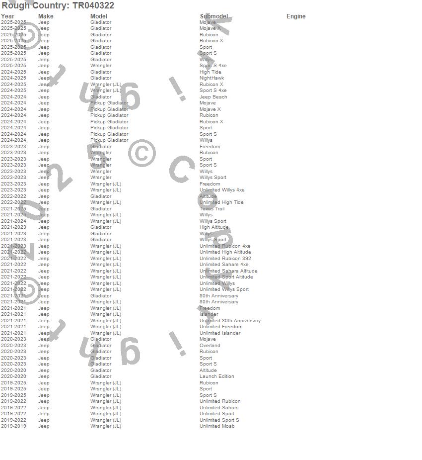 Below is an abbreviated list of applications for the Heavy Duty Steering Kit.Gladiator, Pickup Gladiator, Wrangler, Wrangler (JL), Jeep, 2025, 2024, 2023, 2022, 2021, 2020, 2019