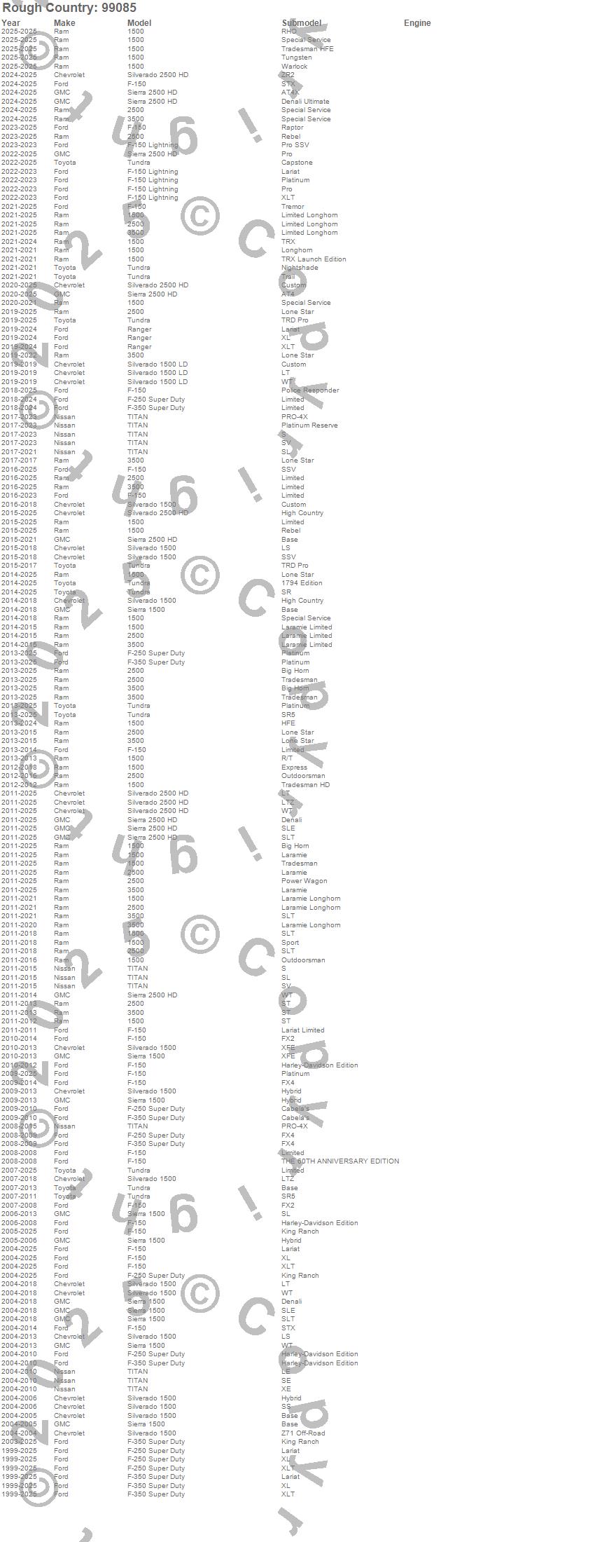 Brand: Rough CountryPart Number: 99085Truck Bed Tailgate Extension Type: 26 in. Extension - Incl. Straps And HardwareUPC: 840269962806