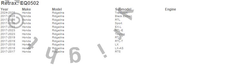Below is an abbreviated list of applications for the Retrax EQ Retractable Tonneau Cover.Ridgeline, Honda, 2026, 2025, 2024, 2023, 2022, 2021, 2020, 2019, 2018, 2017