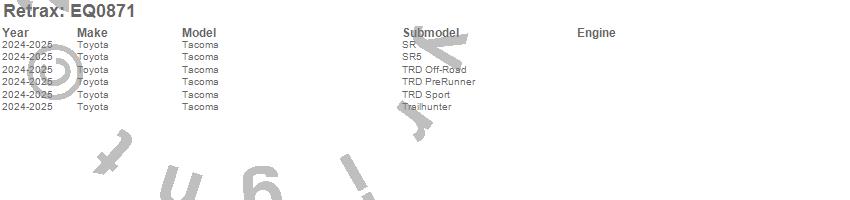 Below is an abbreviated list of applications for the Retrax EQ Retractable Tonneau Cover.Tacoma, Toyota, 2025, 2024
