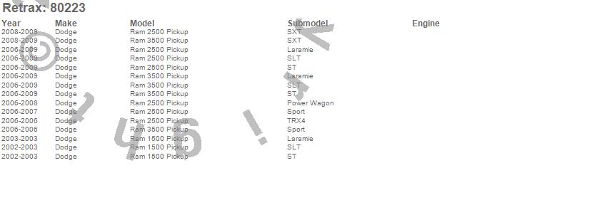 Below is an abbreviated list of applications for the RetraxPRO MX Retractable Tonneau Cover.Ram 1500, Ram 2500, Ram 3500, Dodge, 2009, 2008, 2007, 2006, 2003, 2002