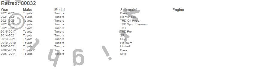 Below is an abbreviated list of applications for the RetraxPRO MX Retractable Tonneau Cover.Tundra, Toyota, 2021, 2020, 2019, 2018, 2017, 2016, 2015, 2014, 2013, 2012, 2011, 2010, 2009, 2008, 2007