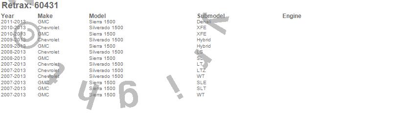 Below is an abbreviated list of applications for the RetraxONE MX Retractable Tonneau Cover.Sierra 1500, Silverado 1500, Chevrolet, GMC, 2013, 2012, 2011, 2010, 2009, 2008, 2007