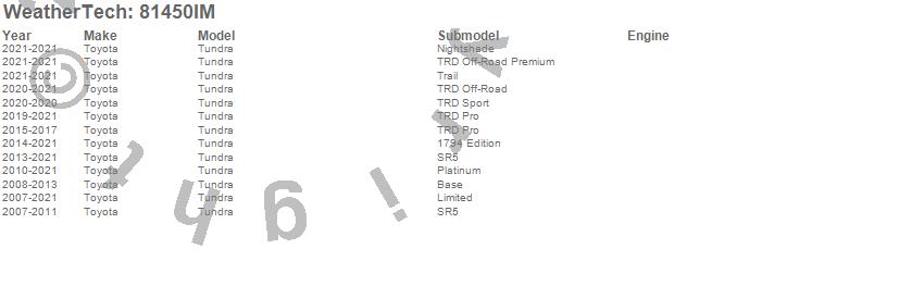 Below is an abbreviated list of applications for the Side Window Deflector.Tundra, Toyota, 2021, 2020, 2019, 2018, 2017, 2016, 2015, 2014, 2013, 2012, 2011, 2010, 2009, 2008, 2007