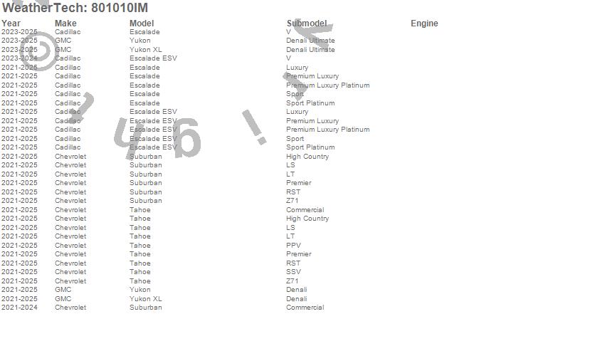 Below is an abbreviated list of applications for the Side Window Deflector.Escalade, Escalade ESV, Suburban, Tahoe, Yukon, Yukon XL, Cadillac, Chevrolet, GMC, 2026, 2025, 2024, 2023, 2022, 2021
