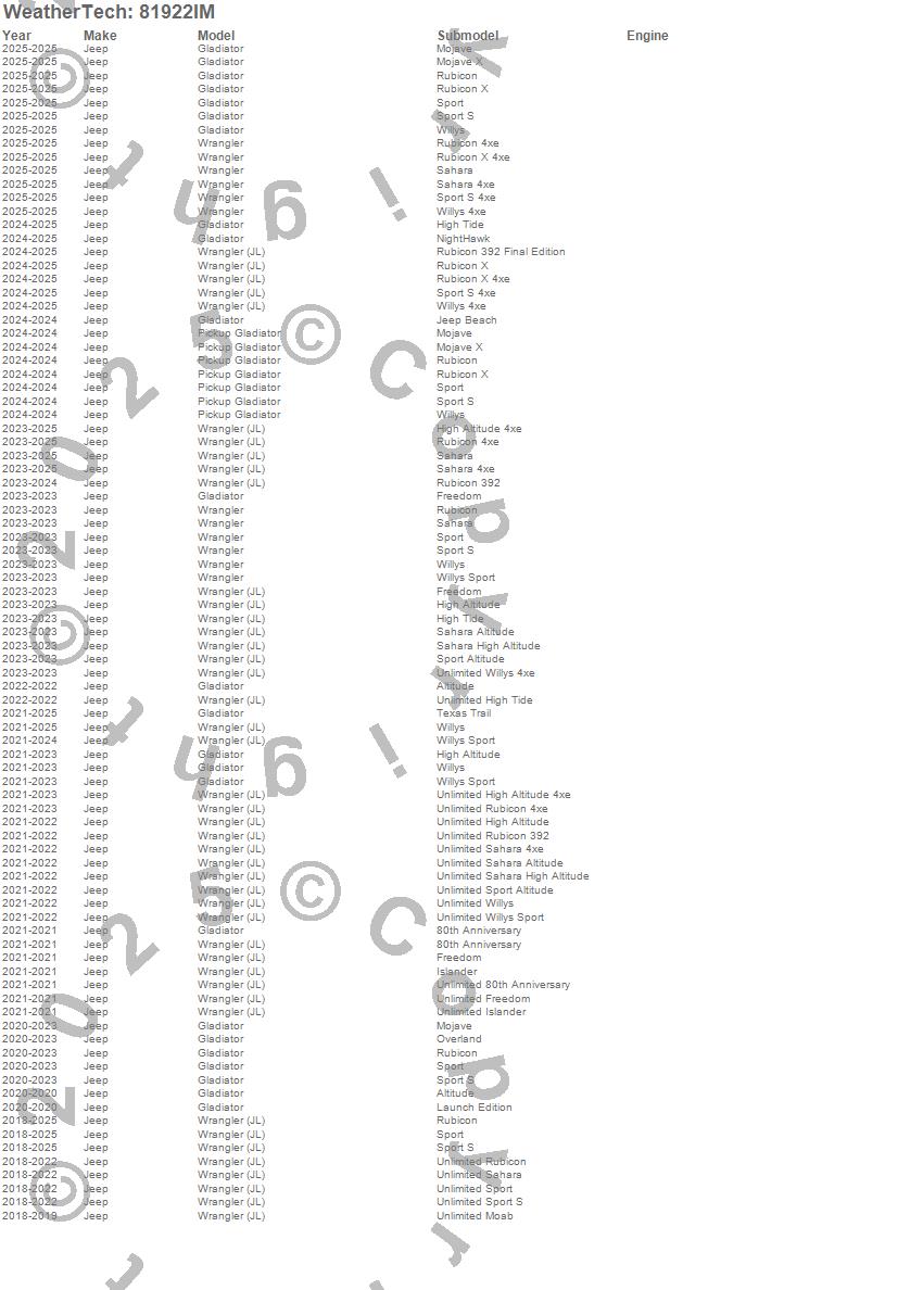 Below is an abbreviated list of applications for the Side Window Deflector.Gladiator, Pickup Gladiator, Wrangler, Wrangler (JL), Jeep, 2026, 2025, 2024, 2023, 2022, 2021, 2020, 2019, 2018