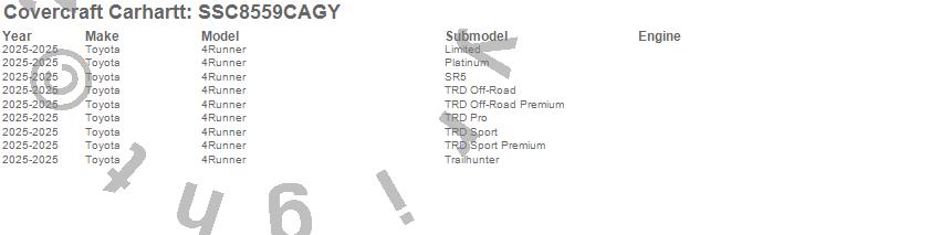 Below is an abbreviated list of applications for the Covercraft Carhartt SeatSaver.4Runner, Toyota, 2025