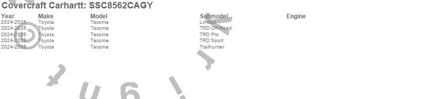 Below is an abbreviated list of applications for the Covercraft Carhartt SeatSaver.Tacoma, Toyota, 2025, 2024