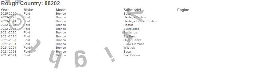Below is an abbreviated list of applications for the Roof Rack System.Bronco, Ford, 2025, 2024, 2023, 2022, 2021