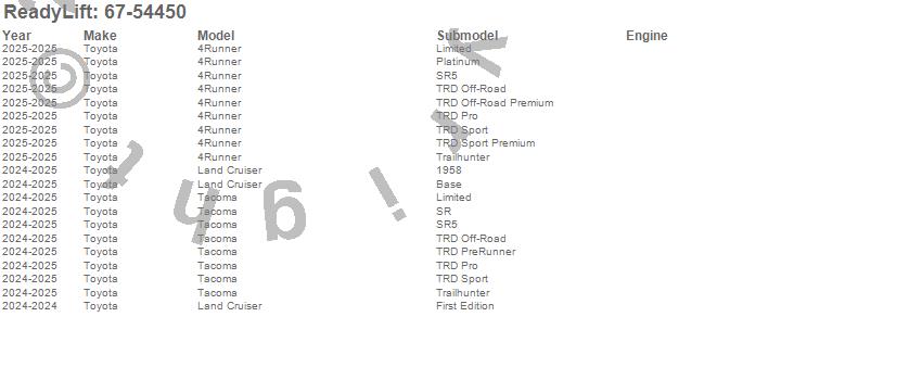 Below is an abbreviated list of applications for the Skid Plate Kit.4Runner, Land Cruiser, Tacoma, Toyota, 2025, 2024