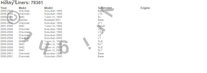 Below is an abbreviated list of applications for the X-act Contour Floor Liner.Escalade ESV, Suburban 1500, Suburban 2500, Yukon XL 1500, Yukon XL 2500, Cadillac, Chevrolet, GMC, 2006, 2005, 2004, 2003, 2002, 2001, 2000