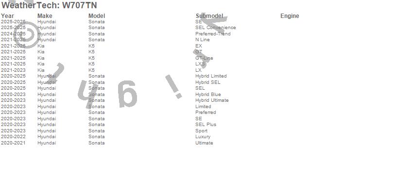 Below is an abbreviated list of applications for the All Weather Floor Mats.K5, Sonata, Hyundai, Kia, 2025, 2024, 2023, 2022, 2021, 2020