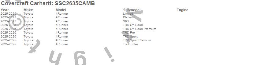 Below is an abbreviated list of applications for the Covercraft Carhartt SeatSaver.4Runner, Toyota, 2025