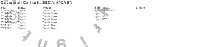 Below is an abbreviated list of applications for the Covercraft Carhartt SeatSaver.Corolla Cross, Toyota, 2024