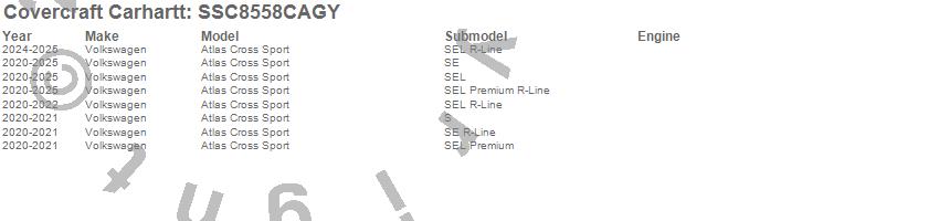 Below is an abbreviated list of applications for the Covercraft Carhartt SeatSaver.Atlas Cross Sport, Volkswagen, 2025, 2024, 2023, 2022, 2021, 2020