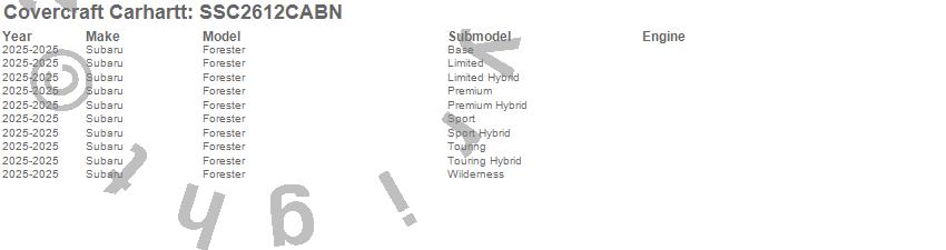 Below is an abbreviated list of applications for the Covercraft Carhartt SeatSaver.Forester, Subaru, 2025