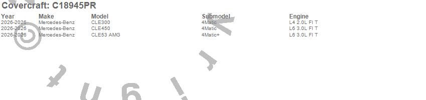 Below is an abbreviated list of applications for the Custom Fit Car Cover.CLE300, CLE450, CLE53 AMG, Mercedes-Benz, 2026