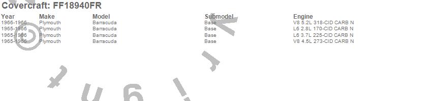 Below is an abbreviated list of applications for the Form-Fit Indoor Custom Car Cover.Barracuda, Plymouth, 1966, 1965