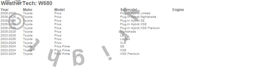Below is an abbreviated list of applications for the All Weather Floor Mats.Prius, Prius Prime, Toyota, 2026, 2025, 2024, 2023