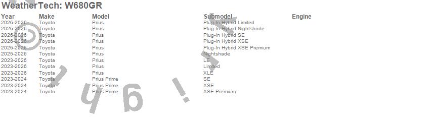 Below is an abbreviated list of applications for the All Weather Floor Mats.Prius, Prius Prime, Toyota, 2026, 2025, 2024, 2023
