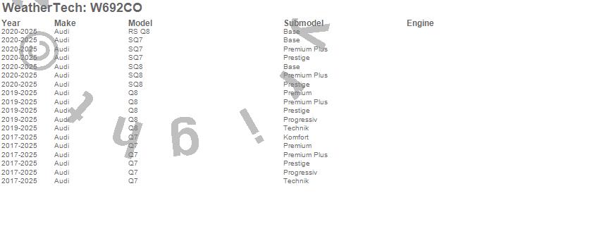 Below is an abbreviated list of applications for the All Weather Floor Mats.Q7, Q8, RS Q8, SQ7, SQ8, Audi, 2026, 2025, 2024, 2023, 2022, 2021, 2020, 2019, 2018, 2017
