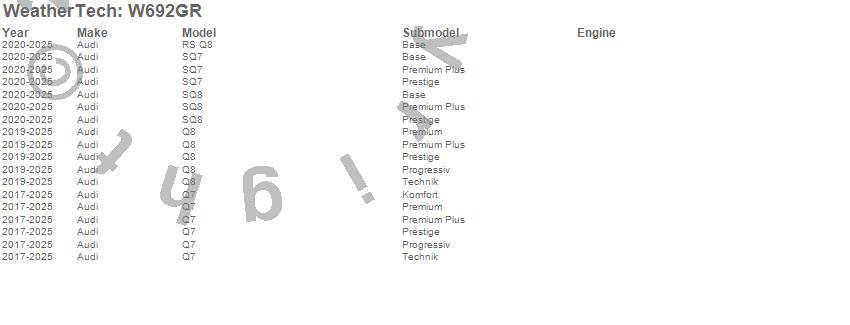 Below is an abbreviated list of applications for the All Weather Floor Mats.Q7, Q8, RS Q8, SQ7, SQ8, Audi, 2026, 2025, 2024, 2023, 2022, 2021, 2020, 2019, 2018, 2017