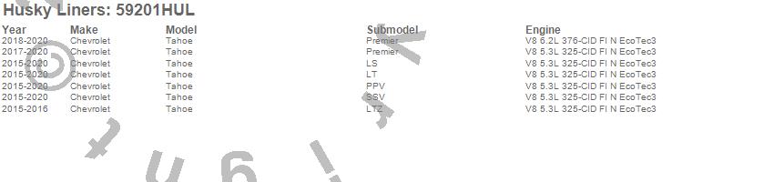 Below is an abbreviated list of applications for the Custom Molded Mud Guards.Tahoe, Chevrolet, 2020, 2019, 2018, 2017, 2016, 2015