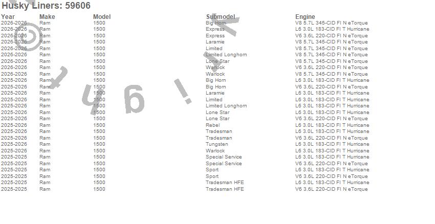 Brand: Husky LinersPart Number: 59606Mud Flap Type: 4 pcs. - Front/Rear - w/Factory Fender Flares - BlackUPC: 753933596064