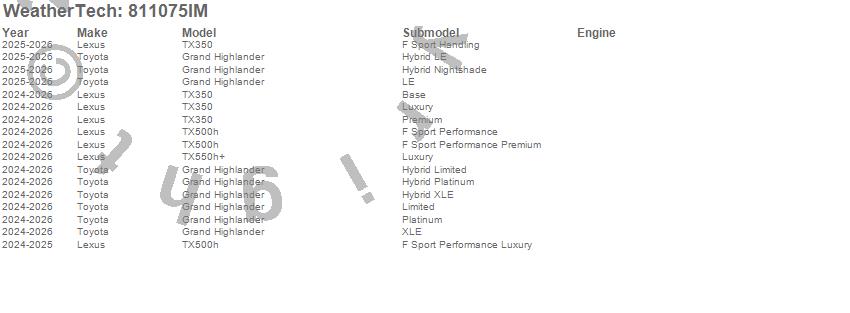 Below is an abbreviated list of applications for the Side Window Deflector.Grand Highlander, TX350, TX500h, TX550h+, Lexus, Toyota, 2026, 2025, 2024