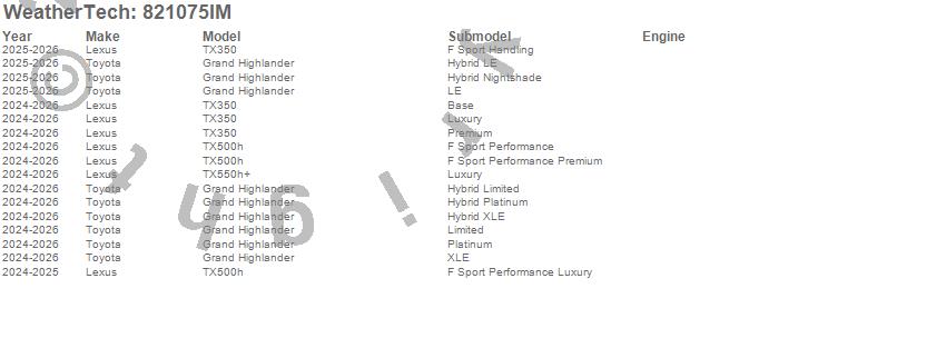 Below is an abbreviated list of applications for the Side Window Deflector Set.Grand Highlander, TX350, TX500h, TX550h+, Lexus, Toyota, 2026, 2025, 2024
