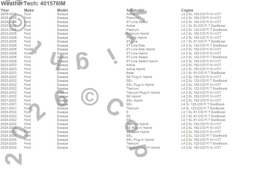 Below is an abbreviated list of applications for the SeatBack Cargo Liner HP.Escape, Ford, 2026, 2025, 2024, 2023, 2022, 2021, 2020