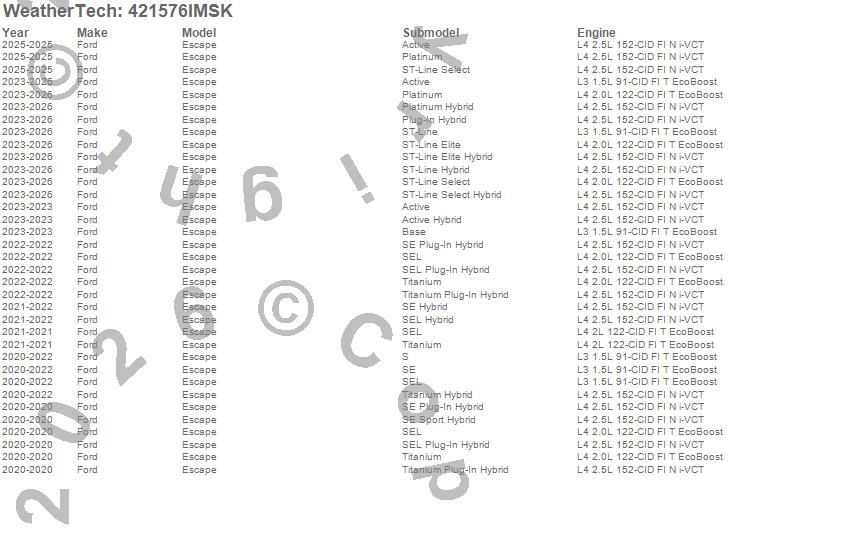 Below is an abbreviated list of applications for the SeatBack Cargo Liner HP w/Bumper Protector.Escape, Ford, 2026, 2025, 2024, 2023, 2022, 2021, 2020