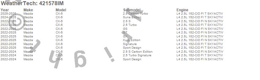 Below is an abbreviated list of applications for the SeatBack Cargo Liner HP.CX-5, Mazda, 2025, 2024, 2023, 2022