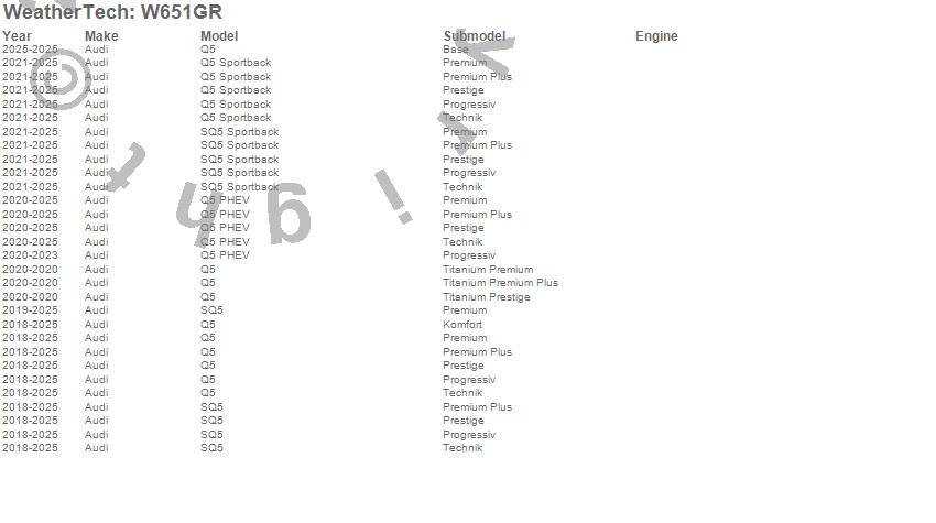 Below is an abbreviated list of applications for the All Weather Floor Mats.Q5, Q5 PHEV, Q5 Sportback, SQ5, SQ5 Sportback, Audi, 2025, 2024, 2023, 2022, 2021, 2020, 2019, 2018