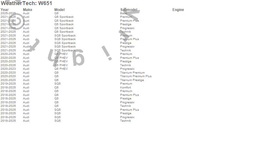 Below is an abbreviated list of applications for the All Weather Floor Mats.Q5, Q5 PHEV, Q5 Sportback, SQ5, SQ5 Sportback, Audi, 2025, 2024, 2023, 2022, 2021, 2020, 2019, 2018