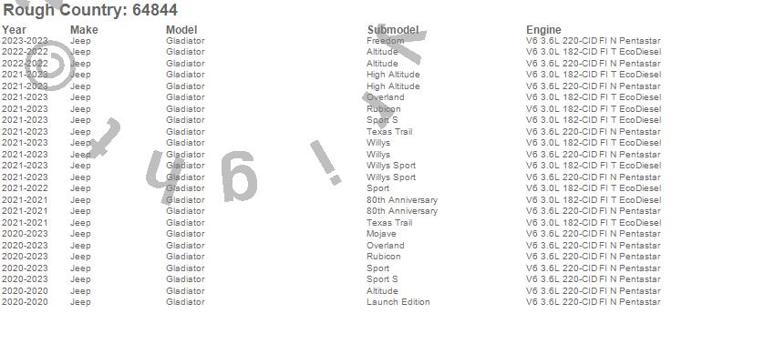 Brand: Rough CountryPart Number: 64844Lift Kit-Suspension w/Shock Type: 2.5 in. Lift - w/M1R Monotube Shocks - w/Coil SpringsUPC: 840269974939