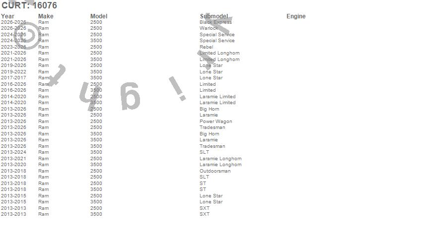 Below is an abbreviated list of applications for the E16 Fifth Wheel Hitch.2500, 3500, Ram, 2026, 2025, 2024, 2023, 2022, 2021, 2020, 2019, 2018, 2017, 2016, 2015, 2014, 2013