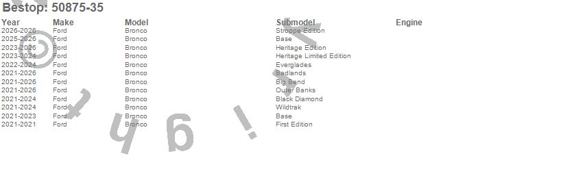 Below is an abbreviated list of applications for the Trektop Soft Tops.Bronco, Ford, 2026, 2025, 2024, 2023, 2022, 2021
