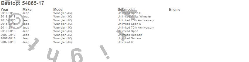 Below is an abbreviated list of applications for the Trektop Pro Soft Tops.Wrangler (JK), Jeep, 2018, 2017, 2016, 2015, 2014, 2013, 2012, 2011, 2010, 2009, 2008, 2007