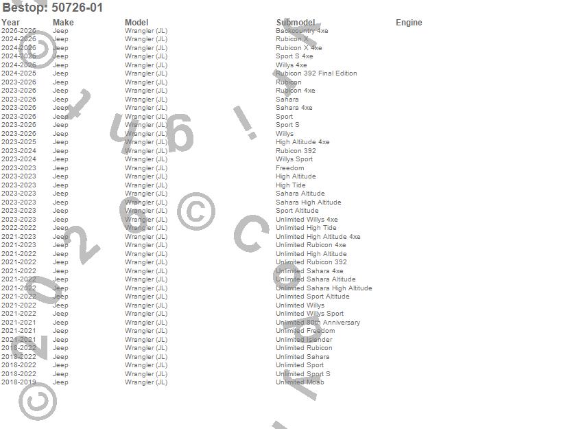 Below is an abbreviated list of applications for the Supertop Ultra Soft Tops.Wrangler (JL), Jeep, 2026, 2025, 2024, 2023, 2022, 2021, 2020, 2019, 2018